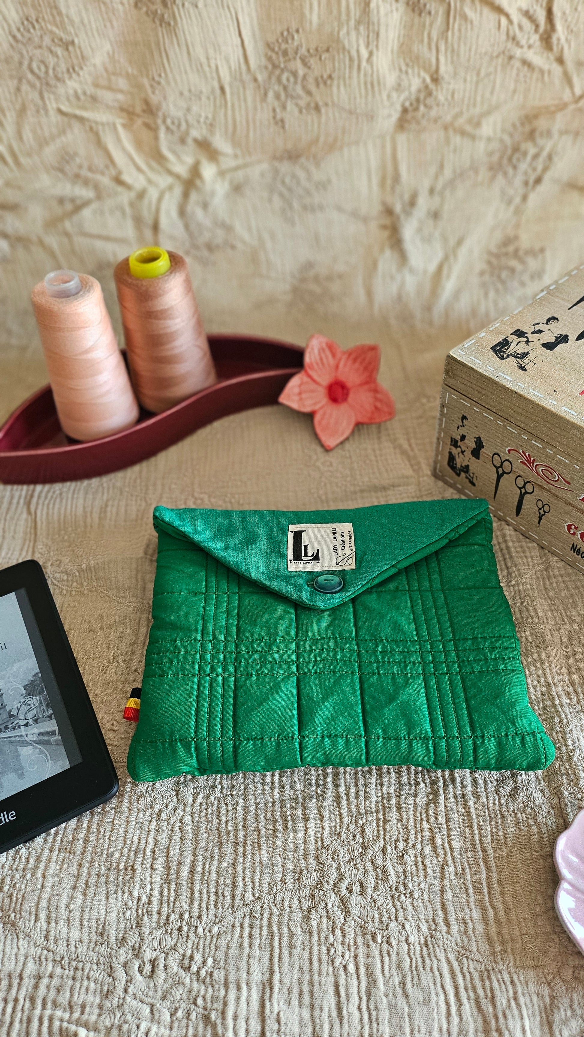 Les tissus utilisés pour la fabrication de cette pochette sont totalement upcyclés. L’intérieur est doublé avec une ouatine pour protéger vos précieuses liseuses